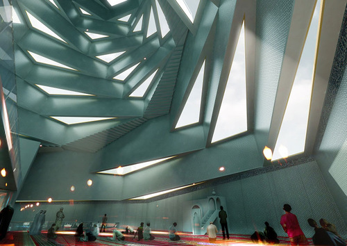 По его словам, в архитектурном плане мечеть примечательна тем, что обрамляющий ее пятигранный каскад обеспечивает во время каждого намаза концентрацию света на одной из пяти граней.