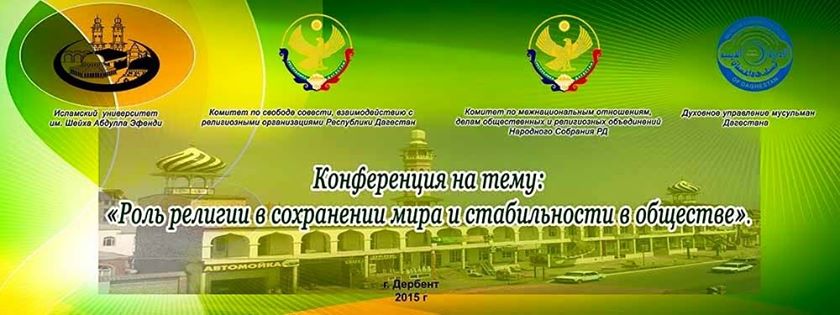 6 мая 2015 г. Комитет по свободе совести, взаимодействию с религиозными организациями совместно с Исламским университетом им. Шейха Абдулла Эфенди, с участием ДУМД РД проводит конференцию на тему: "Роль религии в сохранении мира и стабильности в обществе".